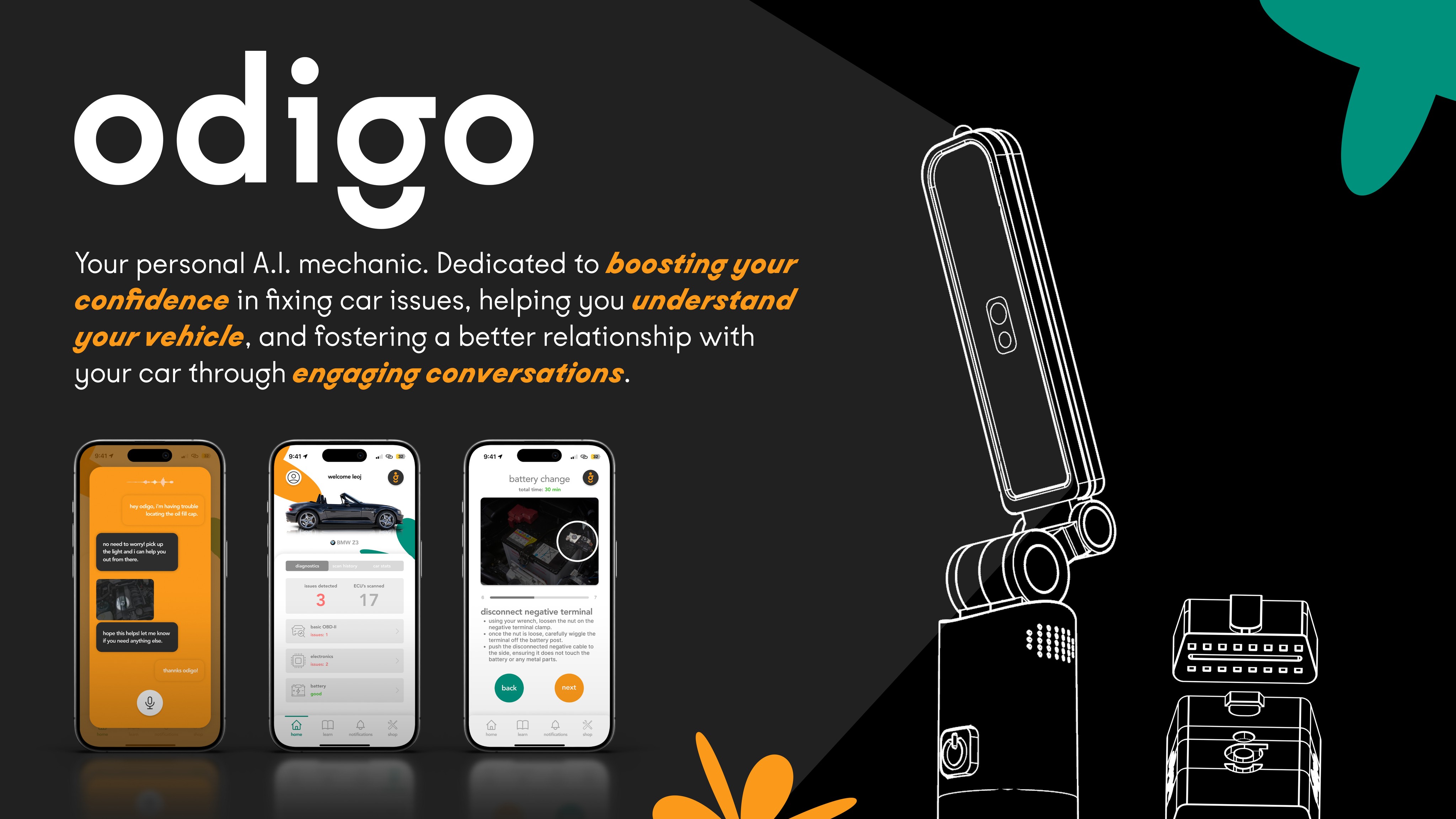 Odigo is your personal A.I. mechanic. Dedicated to boosting your confidence in fixing car issues, helping you understand your vehicle, and fostering a better relationship with your car through engaging conversations.
